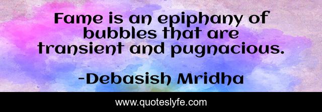 This page presents the quote "Fame is an epiphany of bubbles that are transient and pugnacious.". Author of this quote is Debasish Mridha. This quote is about philosophy, debasish-mridha, quotes, debasish-mridha-md, inspirational, transient-and-pugnacious, enthusiasm, fame, what-is-fame,.