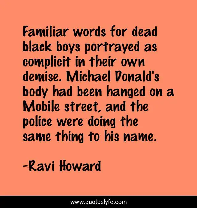 "Ravi Howard Quotes." Quoteslyfe.com, 2025. Sat. 06 Dec. 2025. <https://www.quoteslyfe.com/quote/Familiar-words-for-dead-black-boys-portrayed-200462>.