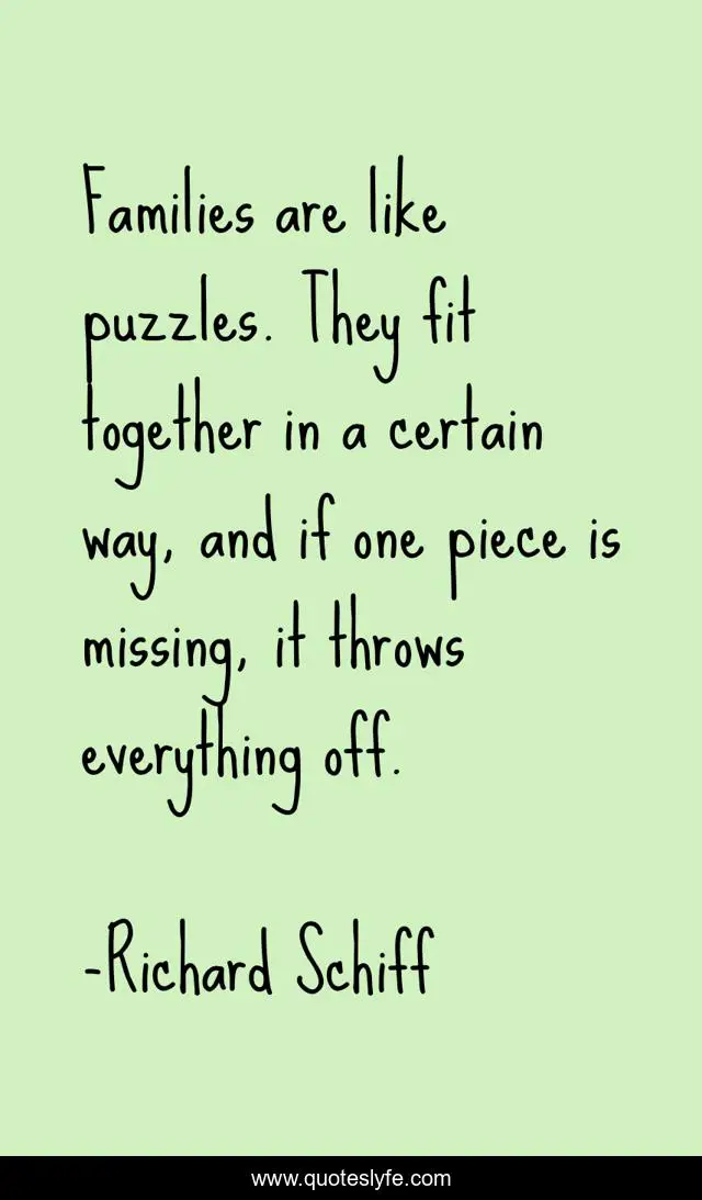 This page presents the quote "Families are like puzzles. They fit together in a certain way, and if one piece is missing, it throws everything off.". Author of this quote is Richard Schiff. .