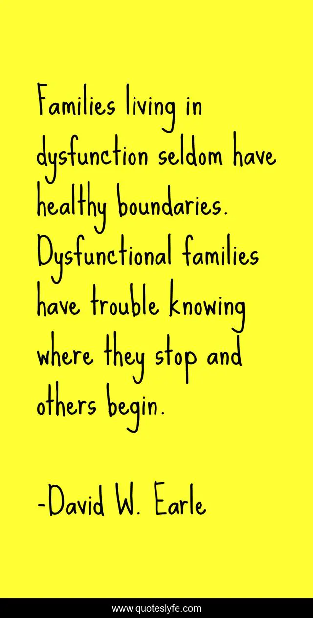 This page presents the quote "Families living in dysfunction seldom have healthy boundaries. Dysfunctional families have trouble knowing where they stop and others begin.". Author of this quote is David W. Earle. This quote is about boundaries, love, family, dysfunctional-families, dysfunctional-family, family-drama, family-relationships, affection,.