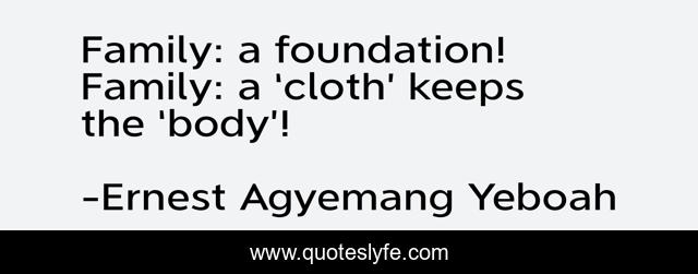 This page presents the quote "Family: a foundation! Family: a ‘cloth’ keeps the ‘body’!". Author of this quote is Ernest Agyemang Yeboah. This quote is about family-relationships, family,.