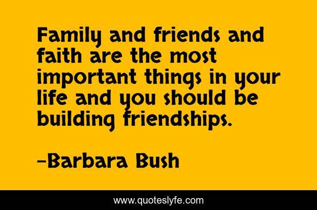 This page presents the quote "Family and friends and faith are the most important things in your life and you should be building friendships.". Author of this quote is Barbara Bush. This quote is about life, friends, family,.