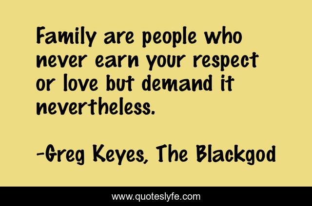 This page presents the quote "Family are people who never earn your respect or love but demand it nevertheless.". Author of this quote is Greg Keyes, The Blackgod. This quote is about respect, family-relationships, love, affection,.