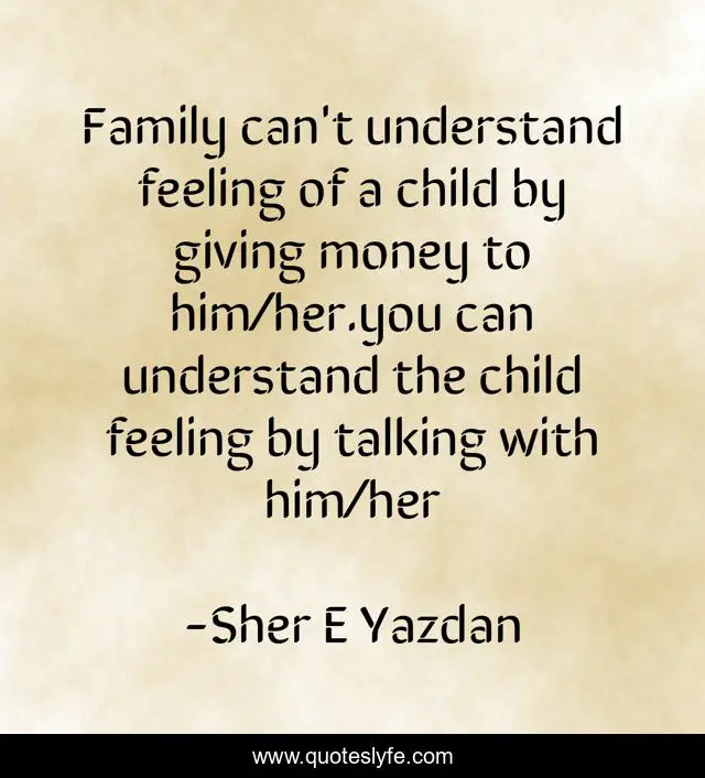This page presents the quote "Family can't understand feeling of a child by giving money to him/her.you can understand the child feeling by talking with him/her". Author of this quote is Sher E Yazdan. This quote is about emotions, family, lonliness,.