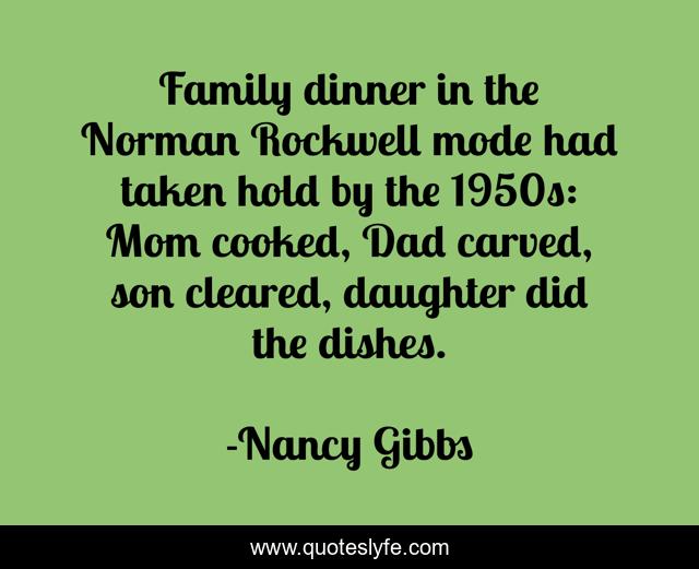 This page presents the quote "Family dinner in the Norman Rockwell mode had taken hold by the 1950s: Mom cooked, Dad carved, son cleared, daughter did the dishes.". Author of this quote is Nancy Gibbs. This quote is about daughter, family, son,.
