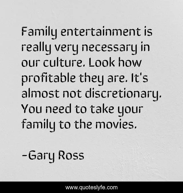 This page presents the quote "Family entertainment is really very necessary in our culture. Look how profitable they are. It's almost not discretionary. You need to take your family to the movies.". Author of this quote is Gary Ross. This quote is about culture, family,.