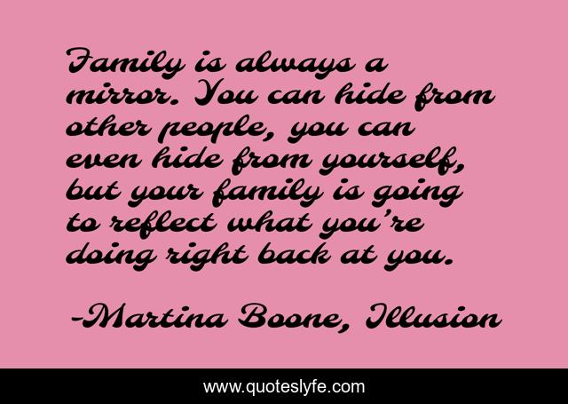 This page presents the quote "Family is always a mirror. You can hide from other people, you can even hide from yourself, but your family is going to reflect what you’re doing right back at you.". Author of this quote is Martina Boone, Illusion. This quote is about self-awareness, family, self-knowledge, mirrors, masks, reflections-of-ourselves, disguise, reflections, family-relationships,.