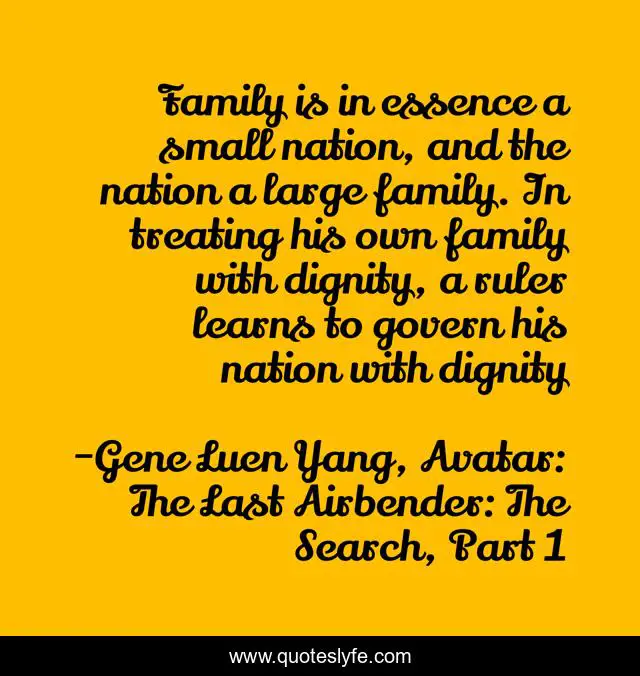 This page presents the quote "Family is in essence a small nation, and the nation a large family. In treating his own family with dignity, a ruler learns to govern his nation with dignity". Author of this quote is Gene Luen Yang, Avatar: The Last Airbender: The Search, Part 1. This quote is about family, ruling, governance, nation,.