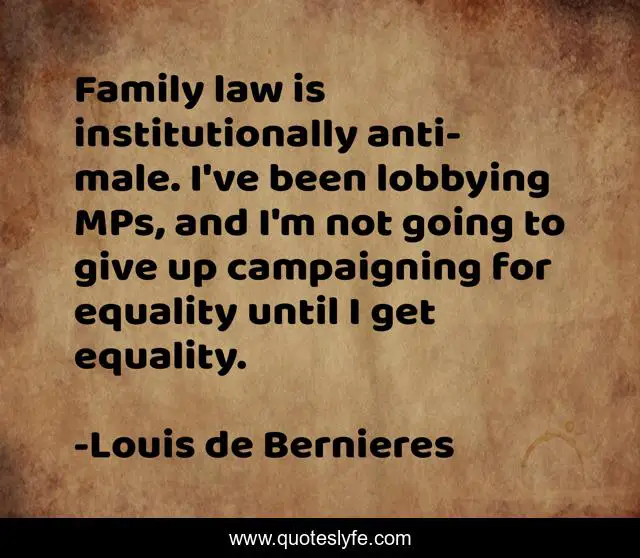 This page presents the quote "Family law is institutionally anti-male. I've been lobbying MPs, and I'm not going to give up campaigning for equality until I get equality.". Author of this quote is Louis de Bernieres. This quote is about law, up, family,.