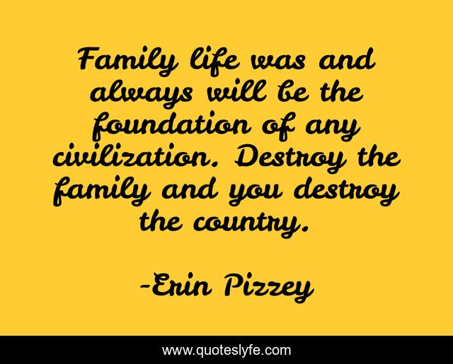 This page presents the quote "Family life was and always will be the foundation of any civilization. Destroy the family and you destroy the country.". Author of this quote is Erin Pizzey. This quote is about civilizational-decline, family, society, society-problem, family-life, civilization,.