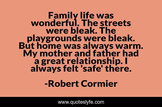 This page presents the quote "Family life was wonderful. The streets were bleak. The playgrounds were bleak. But home was always warm. My mother and father had a great relationship. I always felt 'safe' there.". Author of this quote is Robert Cormier. This quote is about life, family, relationship,.