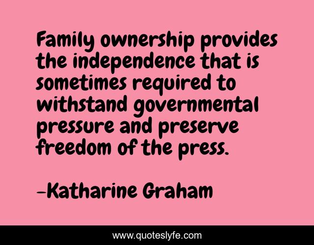 This page presents the quote "Family ownership provides the independence that is sometimes required to withstand governmental pressure and preserve freedom of the press.". Author of this quote is Katharine Graham. This quote is about freedom, family, pressure,.