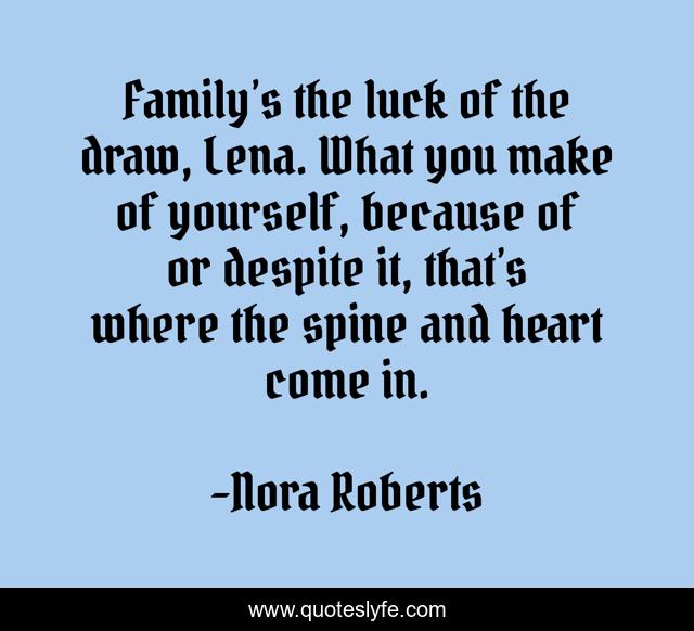 This page presents the quote "Family’s the luck of the draw, Lena. What you make of yourself, because of or despite it, that’s where the spine and heart come in.". Author of this quote is Nora Roberts. This quote is about heart, strength, family, courage, family-relationships, family-drama, luck,.