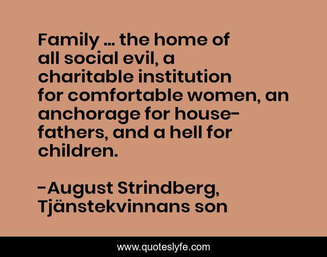 This page presents the quote "Family ... the home of all social evil, a charitable institution for comfortable women, an anchorage for house-fathers, and a hell for children.". Author of this quote is August Strindberg, Tjänstekvinnans son. This quote is about family, men, social-institutions, marriage, hell, children, women,.