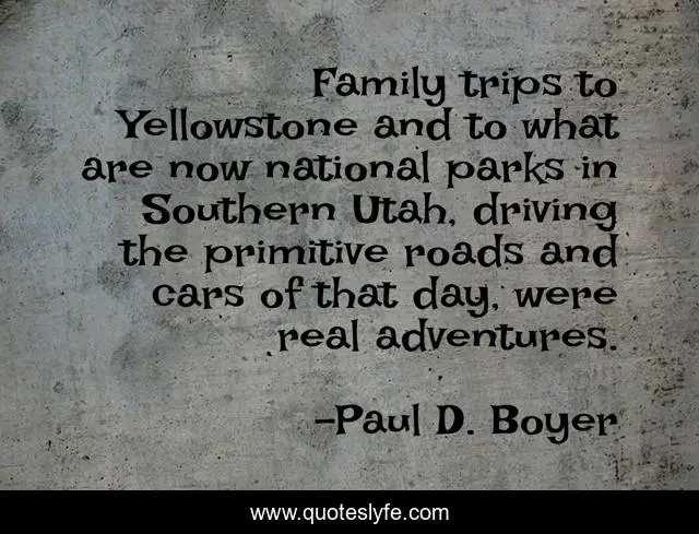 This page presents the quote "Family trips to Yellowstone and to what are now national parks in Southern Utah, driving the primitive roads and cars of that day, were real adventures.". Author of this quote is Paul D. Boyer. This quote is about roads, car, day,.