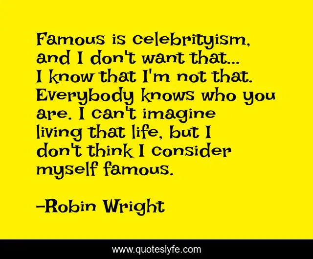 This page presents the quote "Famous is celebrityism, and I don't want that... I know that I'm not that. Everybody knows who you are. I can't imagine living that life, but I don't think I consider myself famous.". Author of this quote is Robin Wright. This quote is about life, myself,.