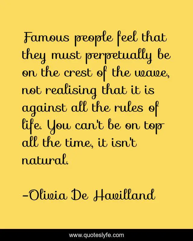 This page presents the quote "Famous people feel that they must perpetually be on the crest of the wave, not realising that it is against all the rules of life. You can't be on top all the time, it isn't natural.". Author of this quote is Olivia De Havilland. This quote is about rules, life, time,.