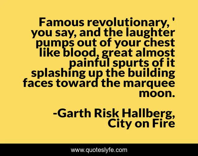 This page presents the quote "Famous revolutionary, ' you say, and the laughter pumps out of your chest like blood, great almost painful spurts of it splashing up the building faces toward the marquee moon.". Author of this quote is Garth Risk Hallberg, City on Fire. This quote is about city-on-fire, metaphor, description, garth-risk-hallberg, laughing, laughter,.