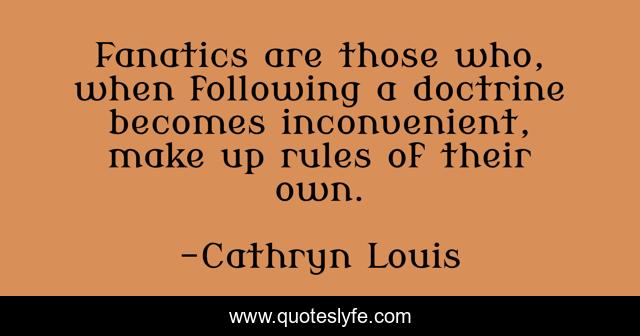 This page presents the quote "Fanatics are those who, when following a doctrine becomes inconvenient, make up rules of their own.". Author of this quote is Cathryn Louis. This quote is about rules, doctrine, fanatic,.