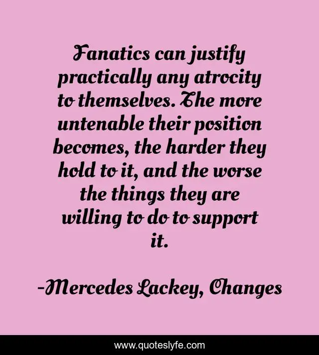 "Mercedes Lackey, Changes Quotes." Quoteslyfe.com, 2025. Fri. 05 Dec. 2025. <https://www.quoteslyfe.com/quote/Fanatics-can-justify-practically-any-atrocity-to-9456>.