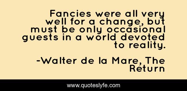 This page presents the quote "Fancies were all very well for a change, but must be only occasional guests in a world devoted to reality.". Author of this quote is Walter de la Mare, The Return. This quote is about fantasy, reality,.
