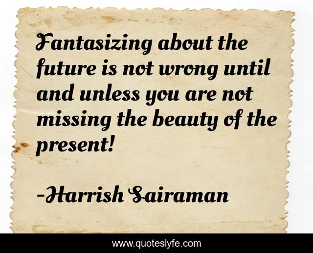 This page presents the quote "Fantasizing about the future is not wrong until and unless you are not missing the beauty of the present!". Author of this quote is Harrish Sairaman. This quote is about fantasy, future, beauty, present,.