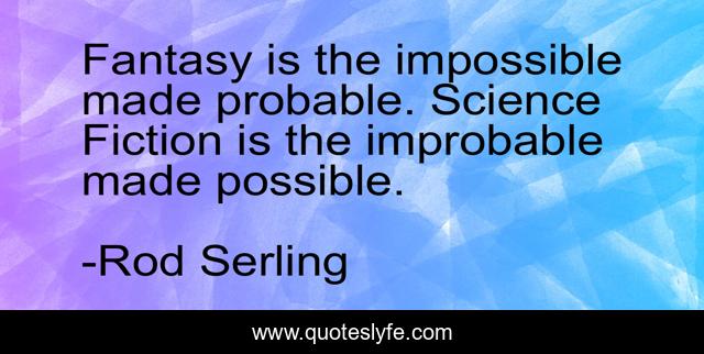 This page presents the quote "Fantasy is the impossible made probable. Science Fiction is the improbable made possible.". Author of this quote is Rod Serling. This quote is about probable, fantasy, possible, science-fiction, improbable, impossible,.
