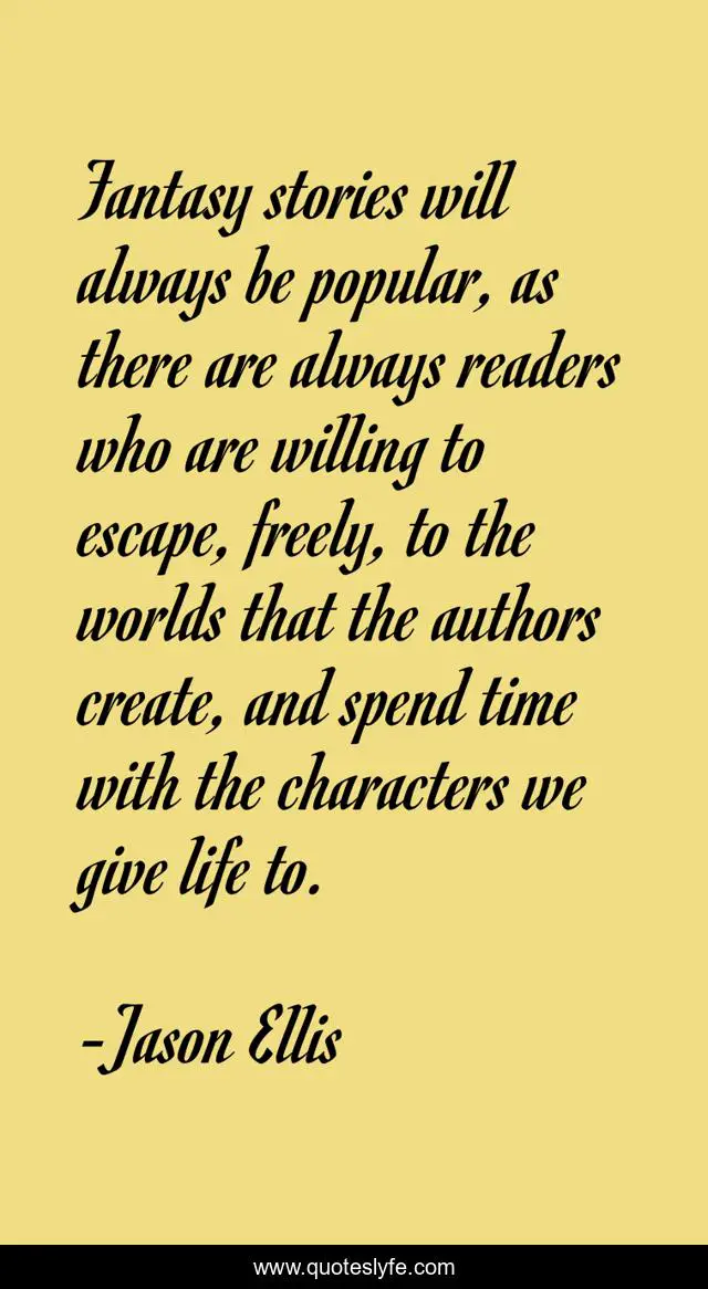 This page presents the quote "Fantasy stories will always be popular, as there are always readers who are willing to escape, freely, to the worlds that the authors create, and spend time with the characters we give life to.". Author of this quote is Jason Ellis. This quote is about fantasy, fantasy-literature, fantasy-fiction,.