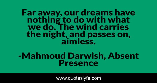 This page presents the quote "Far away, our dreams have nothing to do with what we do. The wind carries the night, and passes on, aimless.". Author of this quote is Mahmoud Darwish, Absent Presence. .