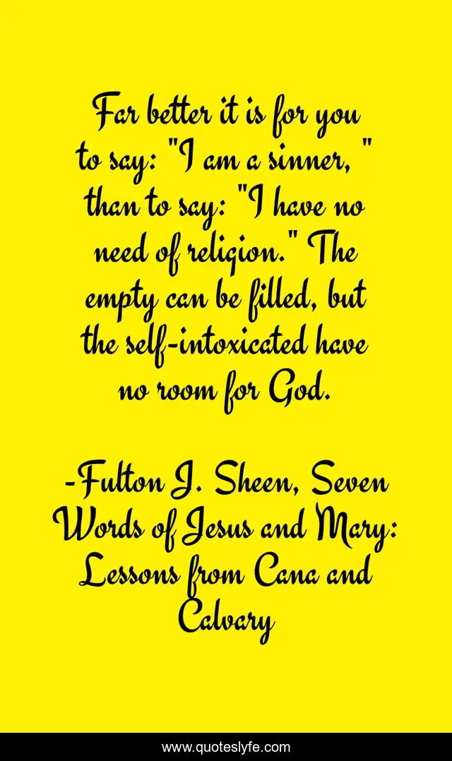This page presents the quote "Far better it is for you to say: "I am a sinner, " than to say: "I have no need of religion." The empty can be filled, but the self-intoxicated have no room for God.". Author of this quote is Fulton J. Sheen, Seven Words of Jesus and Mary: Lessons from Cana and Calvary. This quote is about catholicism, anti-religious, christianity, religion, god, sinners,.