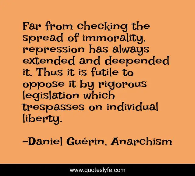 This page presents the quote "Far from checking the spread of immorality, repression has always extended and deepended it. Thus it is futile to oppose it by rigorous legislation which trespasses on individual liberty.". Author of this quote is Daniel Guérin, Anarchism. This quote is about politics, anarchism,.