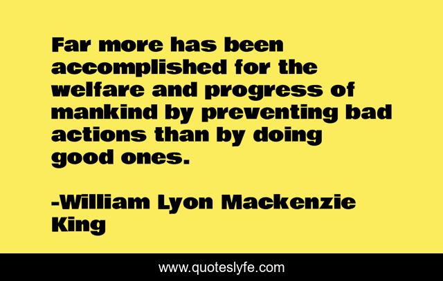 This page presents the quote "Far more has been accomplished for the welfare and progress of mankind by preventing bad actions than by doing good ones.". Author of this quote is William Lyon Mackenzie King. This quote is about law, lawyers,.