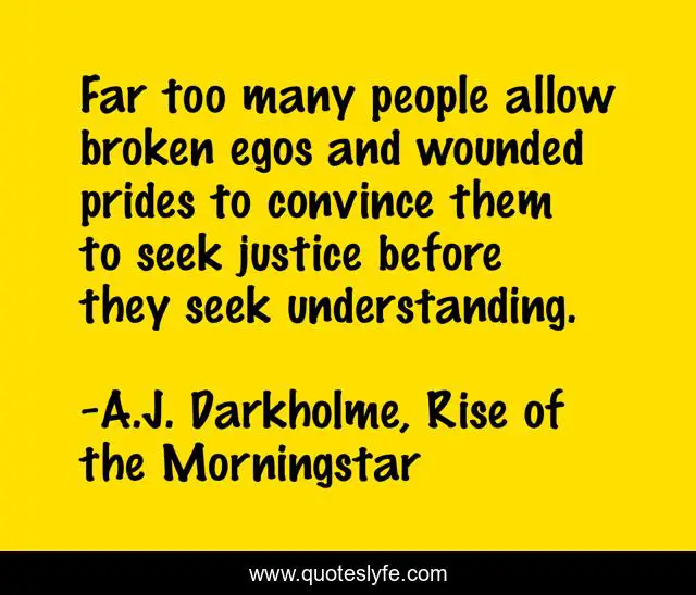 This page presents the quote "Far too many people allow broken egos and wounded prides to convince them to seek justice before they seek understanding.". Author of this quote is A.J. Darkholme, Rise of the Morningstar. This quote is about wounded-pride, careful, self-awareness, people, justice, understanding, ego, broken-ego, others,.