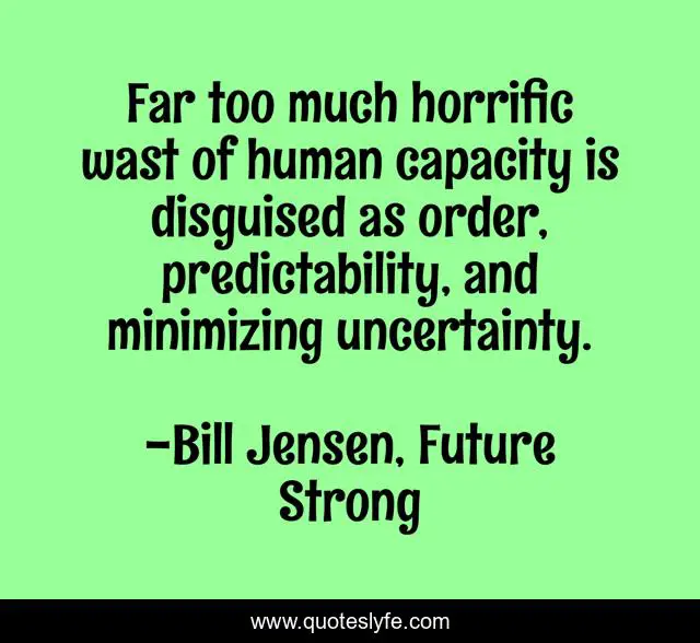 This page presents the quote "Far too much horrific wast of human capacity is disguised as order, predictability, and minimizing uncertainty.". Author of this quote is Bill Jensen, Future Strong. This quote is about enthusiasm, future, leadership, inspirational, self-help,.