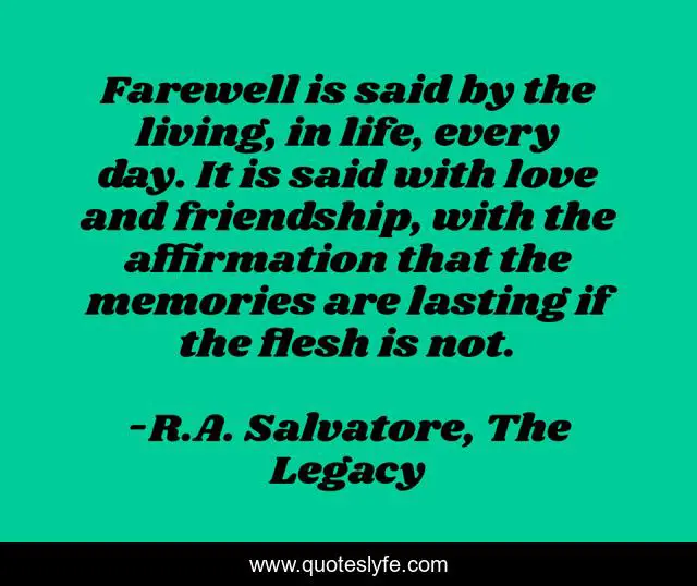 This page presents the quote "Farewell is said by the living, in life, every day. It is said with love and friendship, with the affirmation that the memories are lasting if the flesh is not.". Author of this quote is R.A. Salvatore, The Legacy. This quote is about death, bereavement, mourning,.