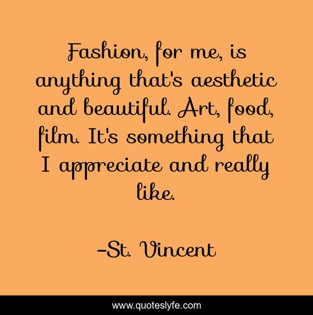 This page presents the quote "Fashion, for me, is anything that's aesthetic and beautiful. Art, food, film. It's something that I appreciate and really like.". Author of this quote is St. Vincent. This quote is about beautiful, me, art,.