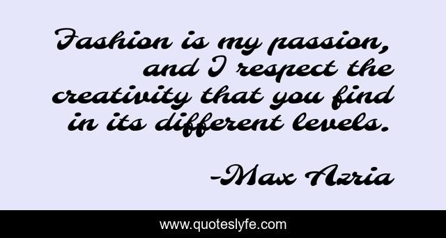 This page presents the quote "Fashion is my passion, and I respect the creativity that you find in its different levels.". Author of this quote is Max Azria. This quote is about creativity, fashion, passion,.