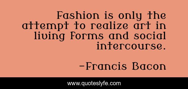 This page presents the quote "Fashion is only the attempt to realize art in living forms and social intercourse.". Author of this quote is Francis Bacon. This quote is about living, fashion, realize,.