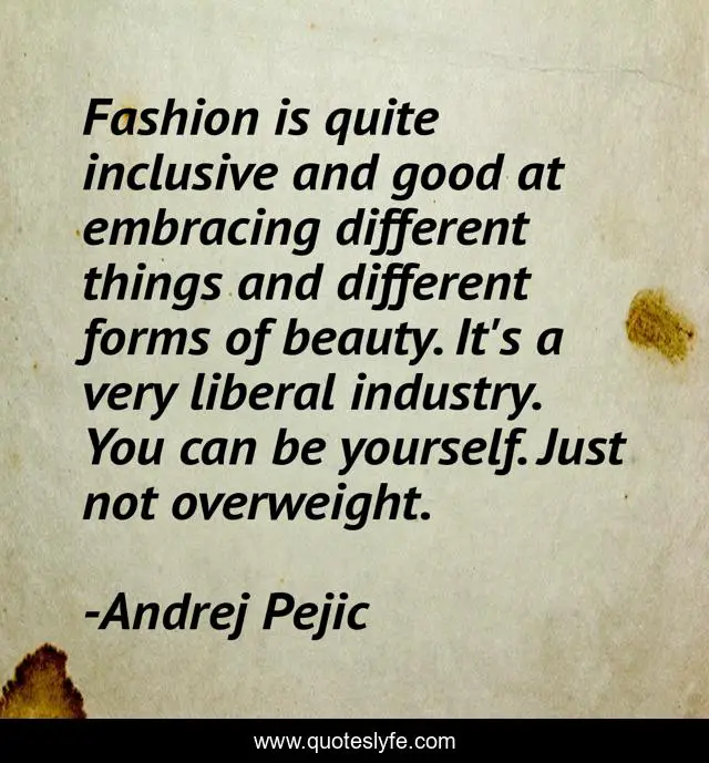 "Andrej Pejic Quotes." Quoteslyfe.com, 2025. Tue. 09 Dec. 2025. <https://www.quoteslyfe.com/quote/Fashion-is-quite-inclusive-and-good-at-316668>.