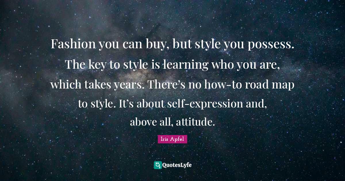 This page presents the quote "Fashion you can buy, but style you possess. The key to style is learning who you are, which takes years. There’s no how-to road map to style. It’s about self-expression and, above all, attitude.". Author of this quote is Iris Apfel. This quote is about style, who you are, expression, learning, keys, fashion, attitude, self, years,.