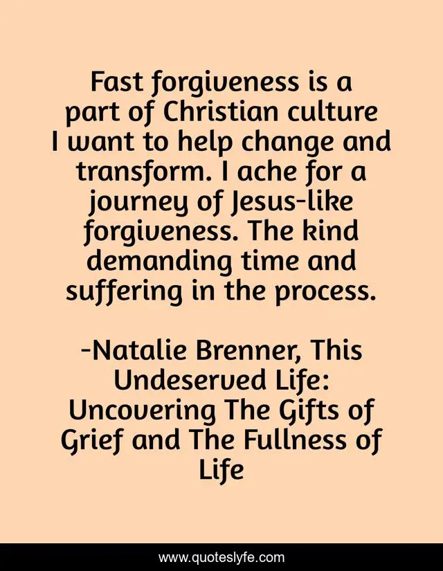 This page presents the quote "Fast forgiveness is a part of Christian culture I want to help change and transform. I ache for a journey of Jesus-like forgiveness. The kind demanding time and suffering in the process.". Author of this quote is Natalie Brenner, This Undeserved Life: Uncovering The Gifts of Grief and The Fullness of Life. This quote is about the-church, forgiveness, forgive, jesus,.