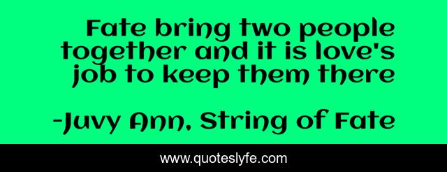 This page presents the quote "Fate bring two people together and it is love's job to keep them there". Author of this quote is Juvy Ann, String of Fate. This quote is about anthologies, romance-novel, humor, destiny, fiction-fantasy, contemporary, literary, inspirational, enthusiasm,.