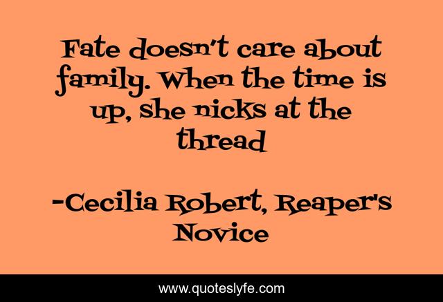This page presents the quote "Fate doesn’t care about family. When the time is up, she nicks at the thread". Author of this quote is Cecilia Robert, Reaper's Novice. This quote is about death, fate,.