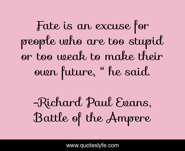 This page presents the quote "Fate is an excuse for people who are too stupid or too weak to make their own future, " he said.". Author of this quote is Richard Paul Evans, Battle of the Ampere. This quote is about villain, fate,.
