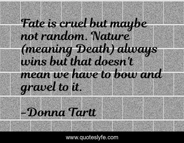 This page presents the quote "Fate is cruel but maybe not random. Nature (meaning Death) always wins but that doesn't mean we have to bow and gravel to it.". Author of this quote is Donna Tartt. This quote is about life, death, destiny, nature,.
