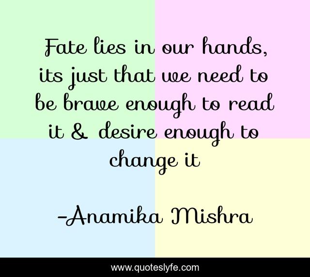 This page presents the quote "Fate lies in our hands, its just that we need to be brave enough to read it & desire enough to change it". Author of this quote is Anamika Mishra. This quote is about life, brave, fate, write, strength, luck,.