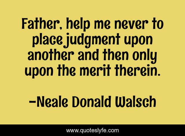 This page presents the quote "Father, help me never to place judgment upon another and then only upon the merit therein.". Author of this quote is Neale Donald Walsch. This quote is about judgement, wisdom,.