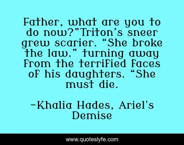 This page presents the quote "Father, what are you to do now?”Triton’s sneer grew scarier. “She broke the law.” turning away from the terrified faces of his daughters. “She must die.". Author of this quote is Khalia Hades, Ariel's Demise. This quote is about triton, ursula, curse, ariel, fiction, mermaids, fantasy, adult, the-little-mermaid,.