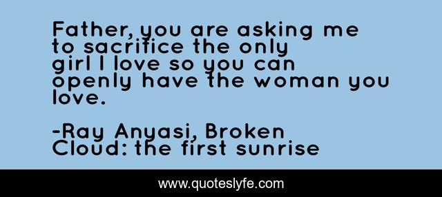 This page presents the quote "Father, you are asking me to sacrifice the only girl I love so you can openly have the woman you love.". Author of this quote is Ray Anyasi, Broken Cloud: the first sunrise. This quote is about sacrifice, love, affection,.