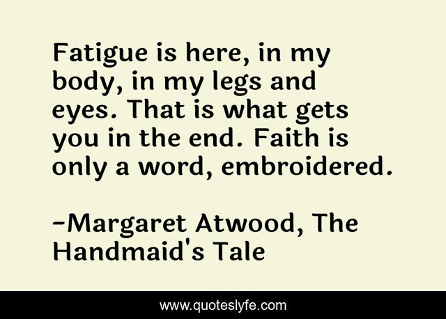 This page presents the quote "Fatigue is here, in my body, in my legs and eyes. That is what gets you in the end. Faith is only a word, embroidered.". Author of this quote is Margaret Atwood, The Handmaid's Tale. This quote is about faith, fatigue,.